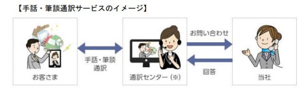 手話・筆談通訳サービスの概要は、耳や言葉の不自由なユーザーから、事故発生・対応時の連絡や契約手続きに関する問合せがあった際、手話・筆談通訳サービスのオペレーターがユーザーに代わって同社へ電話し、ユーザーと同社オペレーターの間にたつことで、双方の発話内容を手話または筆談で通訳するとのことだ。