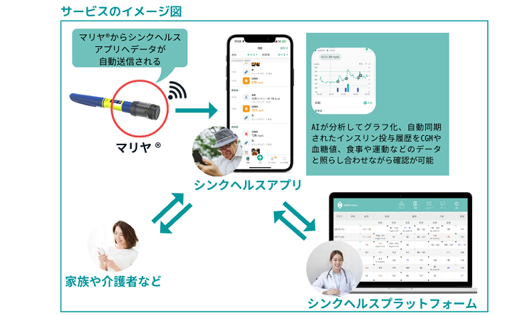 今回同社が連携を開始するスマートセンサー「マリヤ®」は、インスリン製剤に装着することで投与量を自動で認識し、同社アプリ「シンクヘルス」に自動で送信される仕組みとなっている。入力の手間を省くだけでなく、インスリン製剤の投与状況を正確に記録することが可能となるという。