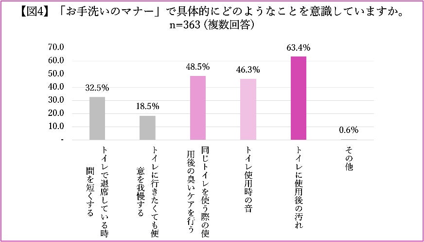 パートナーからの印象を崩さないように意識していることで「お手洗いのマナー」と回答した人へ、具体的な内容を聞くと、「トイレの使用後の汚れ」が63.4%で最も多く、次に「同じトイレを使う際の使用後の臭いケアを行う」が48.5%、「トイレ使用時の音」が46.3%と言う結果に。
