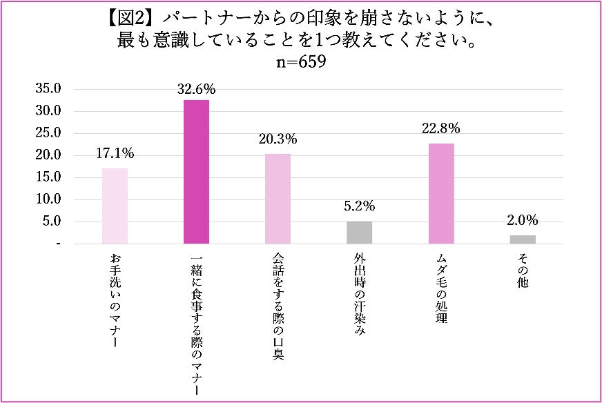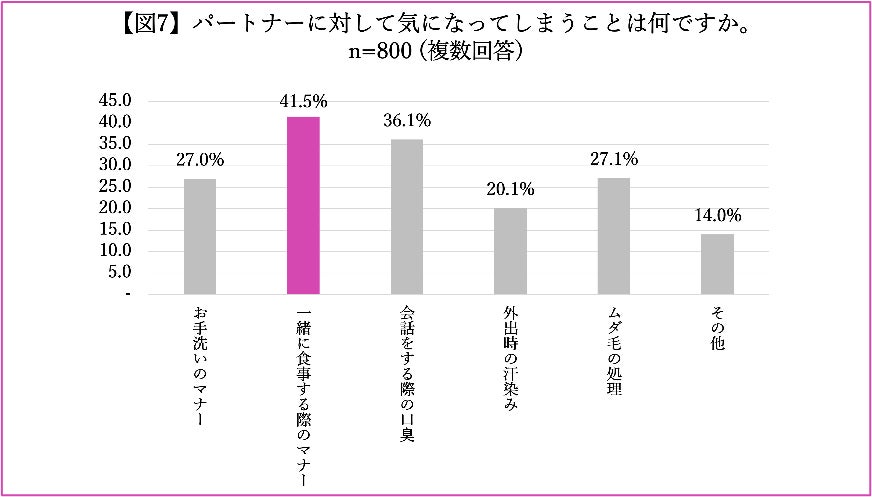 パートナーからの印象を崩さないように意識していることと、パートナーに対して最も気になってしまうことでは、男女ともに多かったのは、「一緒に食事する際のマナー」についてとなっており、それぞれ32.6%と41.5%という結果に。