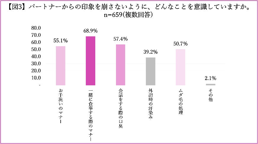 次にパートナーからの印象を崩さないように、どんなことを意識しているか複数回答を見ると男女ともに、55.1%の人が「お手洗いのマナー」を挙げている。最も意識しているポイントではないものの、お手洗い中の見られていない時にもパートナーの印象を崩さないように意識していることがわかる。