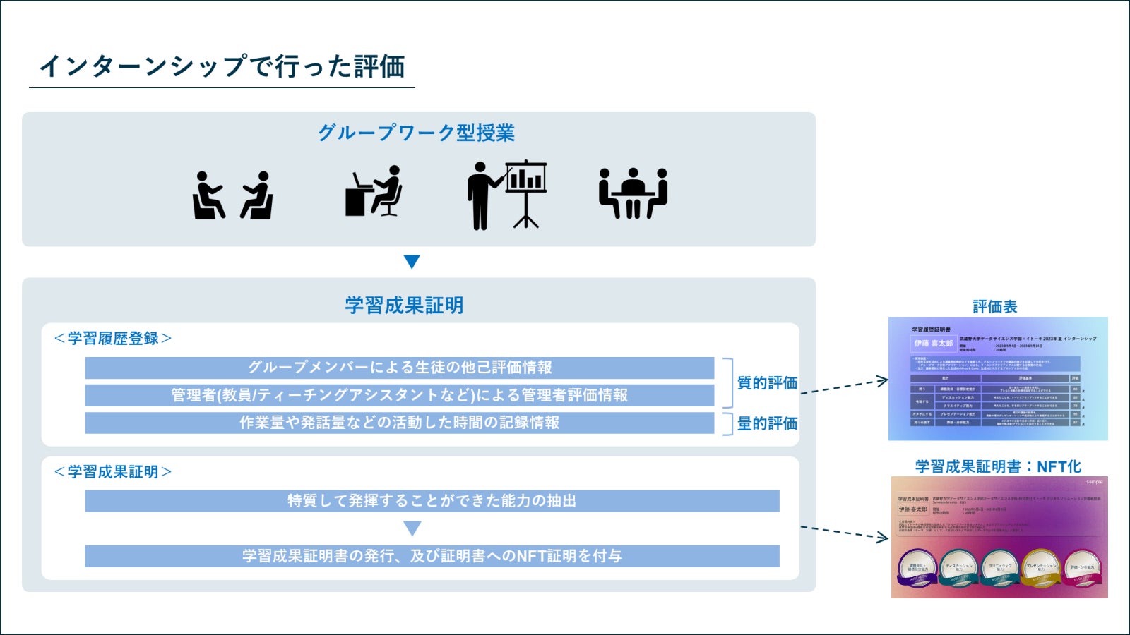 同学と共同開発した学習成果証明システムを利用することで、ディスカッション能力やプレゼンテーション能力、分析能力といった定量的に図りにくい非認知能力を評価することができ、最終的な5つの評価項目の内、得点の高い項目については評価した能力を担保するために学習成果証明書としてNFTで発行。