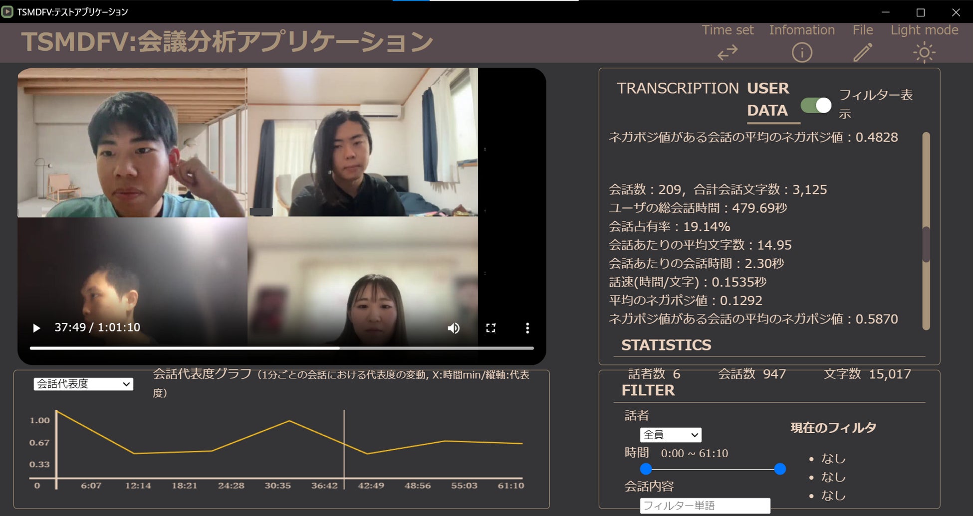 量的評価については、同学と開発を進めているグループワーク分析システムを活用し算出した、発話時間や授業中の作業時間を記録し自動集計。