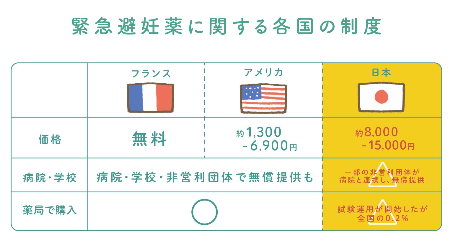 同社は、緊急避妊薬は現在(1)産婦人科を受診しなければならない(2)受診料と薬代を合わせて8,000円〜15,000円かかる、などいつでも誰でもアクセスできるものではないとしている。