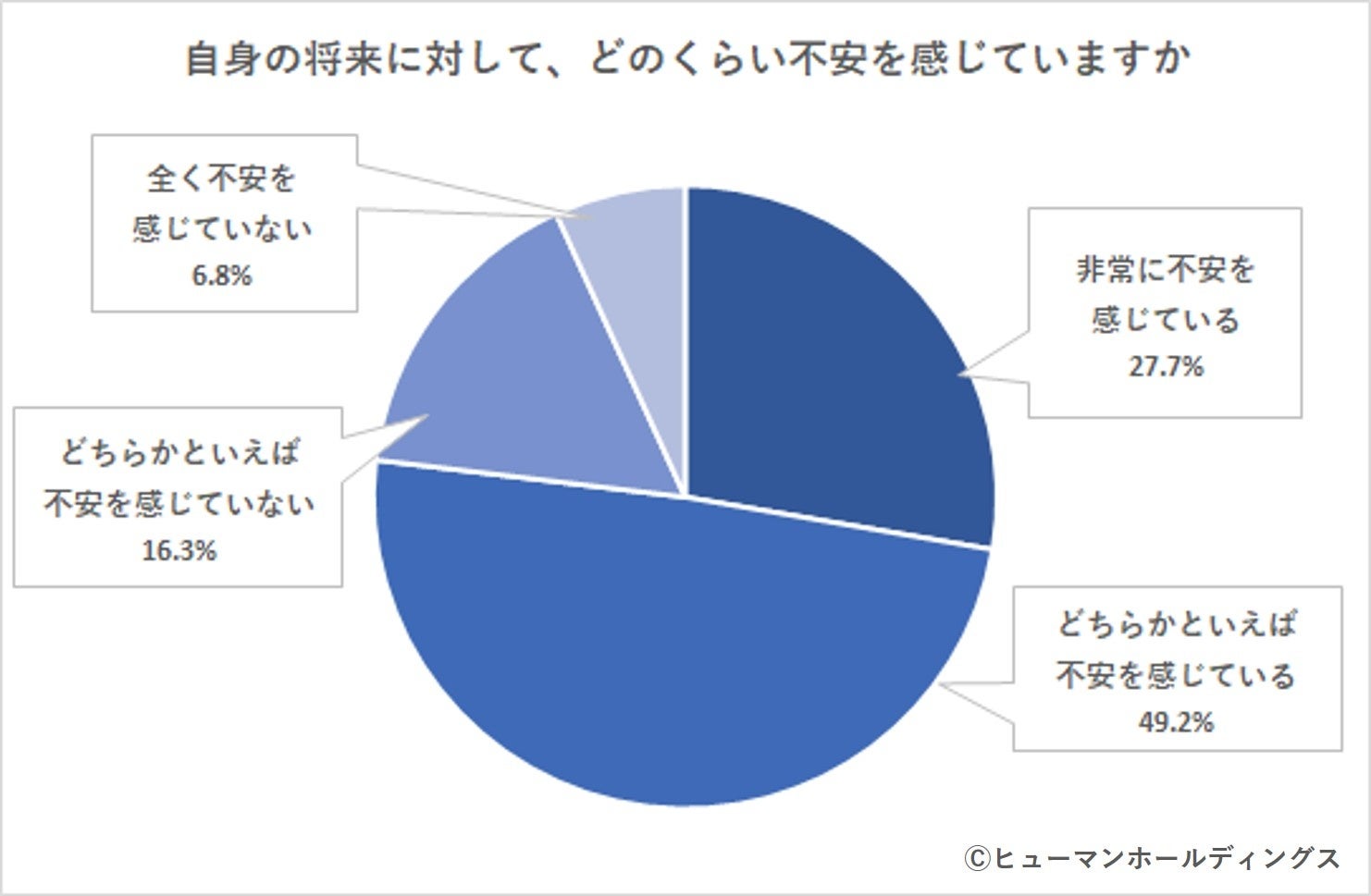 「自身の将来に対して、どのくらい不安を感じているか」という質問では、「非常に不安を感じている」が27.7%、「どちらかといえば不安を感じている」が49.2%となり、76.9%が何かしらの不安を感じている結果となった。