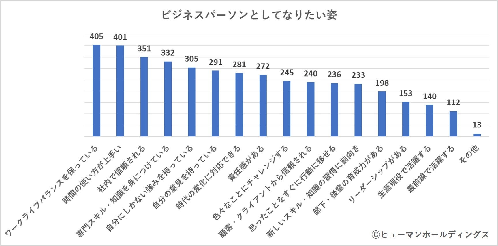 ■「ビジネスパーソンとしてなりたい姿」は、1位「ワークライフバランスを保っている」2位「時間の使い方がうまい」3位「社内で信頼される」