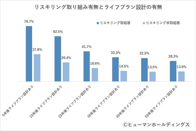 一方、リスキリングに取り組んでいない人は37.8%が設計できているという結果となり、38.9ポイントの差がみられ、リスキリングに取り組んでいる人は、将来を見据えたライフプラン設計がしやすい傾向にあることが浮かび上がった。