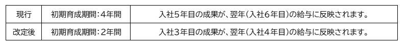 (2)若手社員の成長意欲や自律的なキャリア形成に対する意識の高まりを踏まえて、これまで入社後4年間としていた「初期育成期間」を2年間へ短縮。成果に応じた賃金を早期から支給することで、若手社員の成長・挑戦意欲を刺激し、人財の定着とエンゲージメント向上を図る。