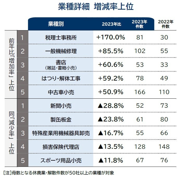 業種を詳細にみると、前年比で最も増加したのは「税理士事務所」(30件→81件、170.0%増)。従前から税理士の高齢化が課題となっていた中で、競争激化による顧問企業の減少、顧問料の低下など経営環境の悪化、インボイス制度の導入など新たな業務のスタートなども影響したとみられる。