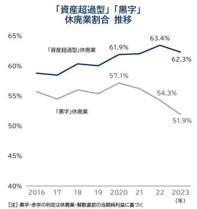 2023年に休廃業した企業のうち、「資産超過型休廃業」は62.3%を占めたほか、休廃業する直前期の決算で当期純損益が「黒字」だった割合は51.9%となり、半数超が黒字休廃業だったものの、その割合は過去最低を更新。