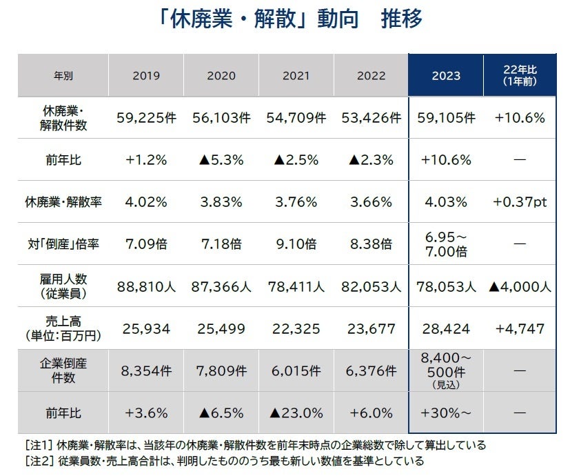 2023年の休廃業動向は、前年から3割超の急増が見込まれる企業倒産(法的整理)とともに増加。