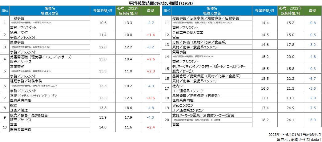 職種別で見ると、残業時間が最も少ない職種1位は、前回8位だった「一般事務」で、前回から-2.7時間の10.6時間となっている。