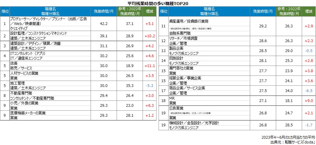 職種別で見ると、残業時間の多い職種1位は前回と同じく「プロデューサー/ディレクター/プランナー(出版/広告/Web/映像関連)」で、前回から+5.1時間の42.2時間となった。