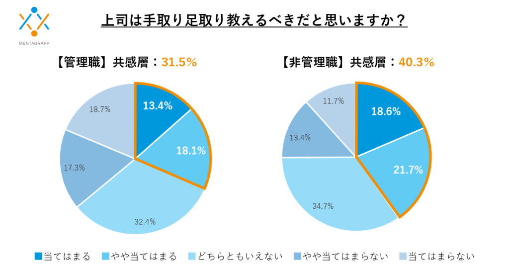 また、「上司は手取り足取り教えるべきだ」という項目でも、管理職は31.5%に対し、非管理職では40.3%と、非管理職の共感層は管理職より8.8ポイント高く、非管理職がより直接的なサポートを求めている傾向が見られた。
