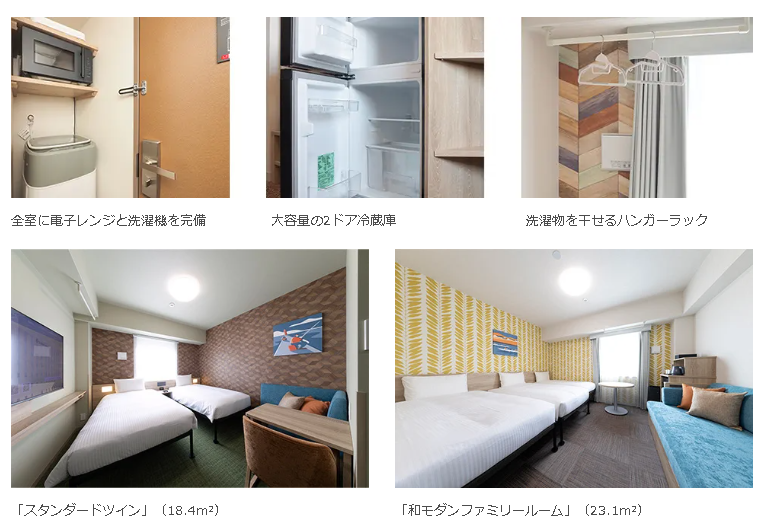 また、全室に洗濯機・電子レンジ・2ドア冷蔵庫・加湿機能付き空気清浄機・50インチの大型スマートTVを完備し、長期の滞在にも便利な設備が整っているとしている。また、IHコンロ付きキッチンを備えた客室もあり、自炊にも対応が可能でとのことだ。