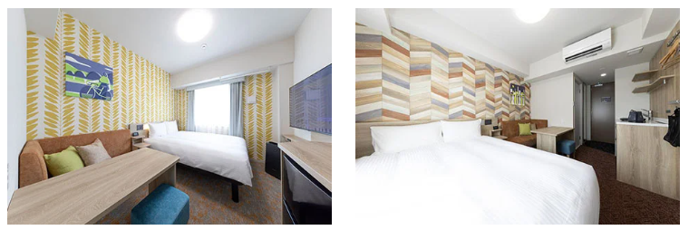 客室は、8割以上を「ダブルルーム」(約15.4平方メートル/ベッド幅150cm)が占め、温かみのある色調で統一した内装に、サータ社製の快眠ベッドや大型テーブルとソファを完備。
