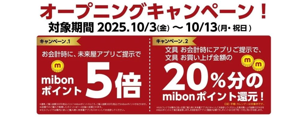さらに、文具の購入時に「未来屋書店公式アプリ」を提示すると、文具購入金額の20%分を後日「mibonポイント」にて還元するとのことだ。