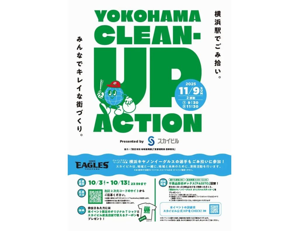 当日はスカイビル周辺および横浜駅東口周辺を、イーグルスの選手と共に清掃(ごみ拾い)するとのことだ。参加者には、同イベントのユニフォームとして「オリジナルTシャツ」を用意しており、終了後は持ち帰ることができるという。