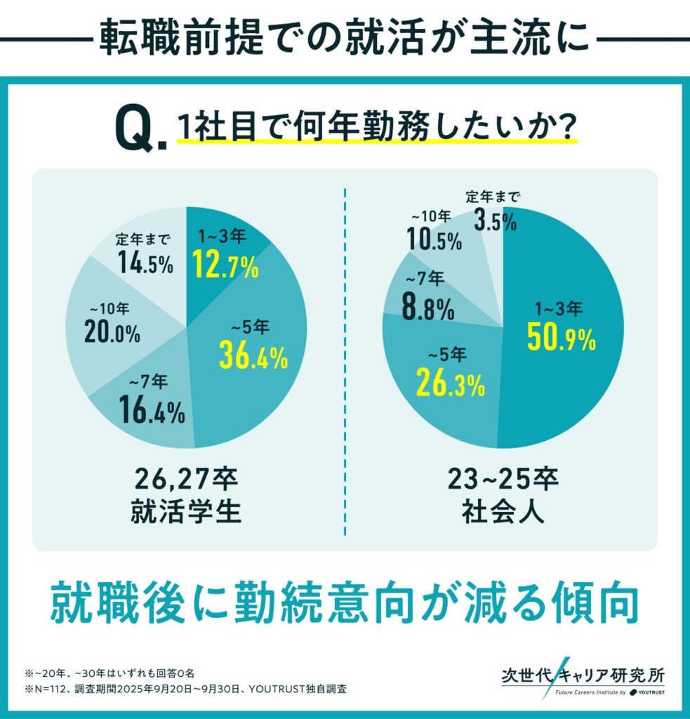 YOUTRUST独自調査にて、26・27卒の就活学生と23〜25卒新社会人層に「1社目で何年勤務したいか?」と質問したところ、新社会人の約8割は5年以内に転職する意向を持っていることが判明。就活学生の約5割から大きく増加傾向となった。