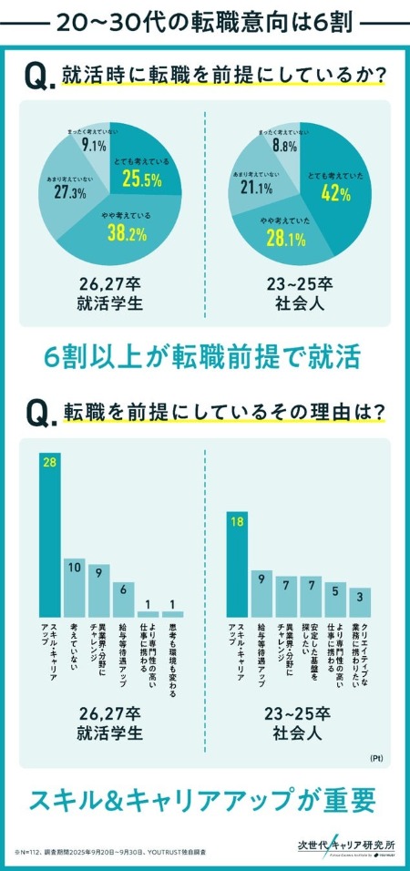 2.転職前提での就活が主流に。26・27卒就活学生層、23〜25卒新社会人層ともに6割以上が転職前提での就活をしていたことが明らかに。