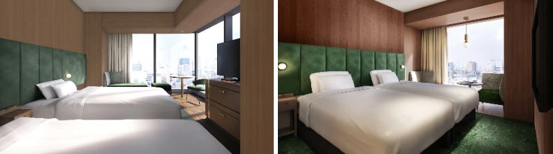 6階から13階の客室フロアでは、グリーンやウッドを基調に配色しているほか、オーバーヘッドシャワーを採用し、スーツケースに配慮したスペースも確保。また、同ホテルの北側に位置する「トラックスビュー」タイプの部屋からは、都心の高層ビル群の夜景と車両基地を望めるという。
