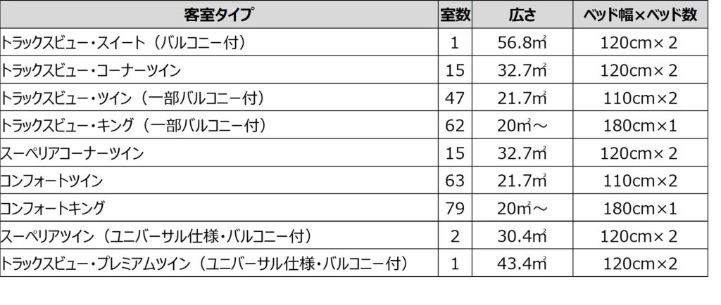 ※スーペリアコーナーツイン、トラックスビュー・コーナーツインはエキストラベッドを入れて、3名での利用が可能