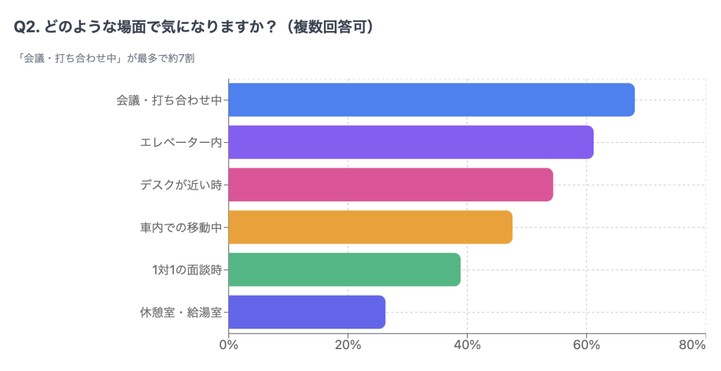 職場で他人の汗・ニオイが気になる場面について聞いたところ、「会議・打ち合わせ中」が約68%で最多、次いで「エレベーター内」が61%、「デスクが近い時」が54%という結果に。密閉空間や近距離でのコミュニケーション時に特に気になることが分かった。