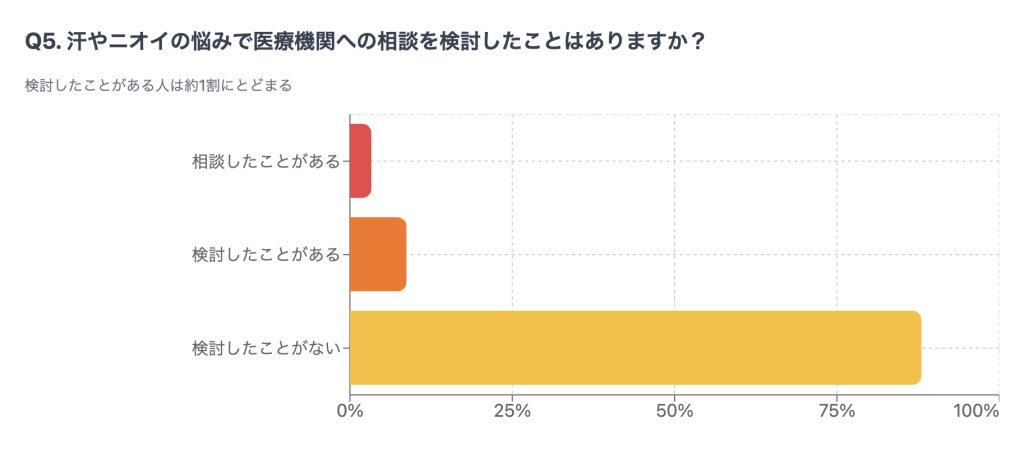 汗やニオイの悩みで美容皮膚科などの医療機関への相談を検討したことがあるか聞いたところ、検討したことがある人は約12%にとどまり、多くの人が制汗剤などの市販品で対処しようとしている実態が明らかに。