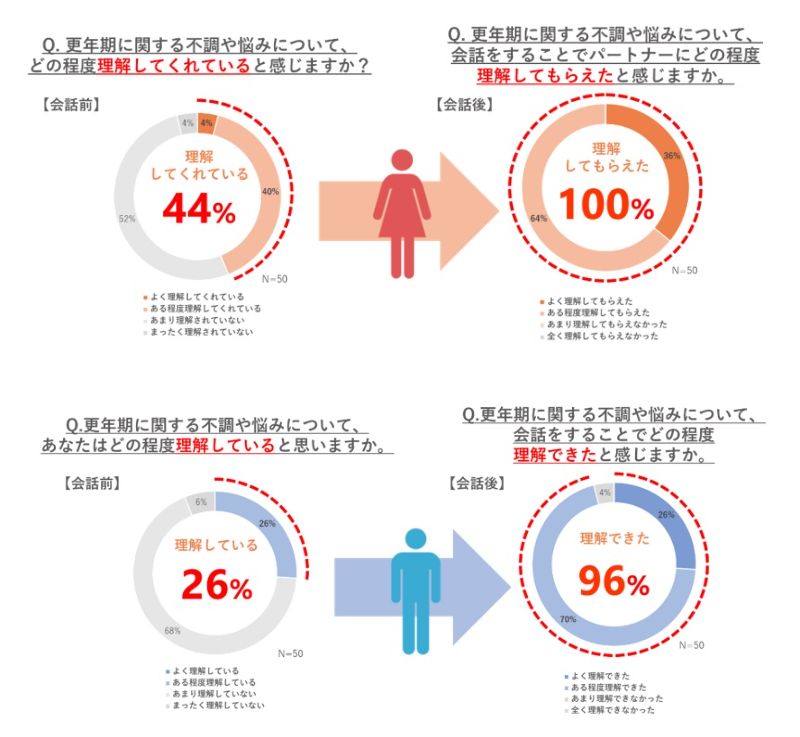 一方、更年期について会話をした後は、女性の100%が「理解してもらえた」、男性の96%が「理解できた」と回答。会話前には「理解されていない」「理解していない」と答える人が多数を占めていたが、会話を通して理解度が大きく改善することが示された。