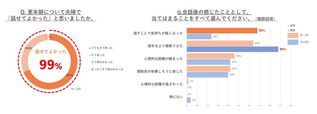 更年期について夫婦で会話を行った後、全体の99%が「話せてよかった」と回答。特に女性は68%が「気持ちが軽くなった」、64%が「相手をより理解できた」と答え、心理的な負担が和らぐ結果に。