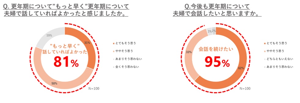 さらに、「もっと早く更年期について夫婦で話していればよかった」と感じた人は全体の81%にのぼり、95%が「今後も更年期について会話を続けたい」と回答。会話は更年期に関する理解を深めるだけでなく、安心感を得て前向きな関係を築くための重要なきっかけになることが示された。