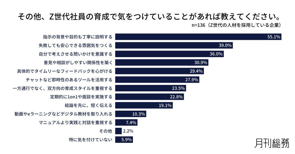 Z世代の育成で気をつけていることについて尋ねたところ、「指示の背景や目的も丁寧に説明する」が55.1%で最も多く、「失敗しても安心できる雰囲気をつくる」が39.0%、「自分で考えさせる問いかけを意識する」が36.0%と続いた(n=136/Z世代の人材を採用している企業)。