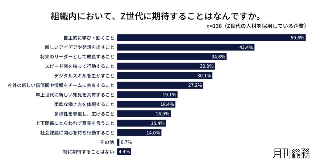 ■Z世代に期待することは「自主的に学び・動くこと」「新しいアイデアや発想を出すこと」「将来のリーダーとして成長すること」など