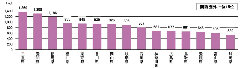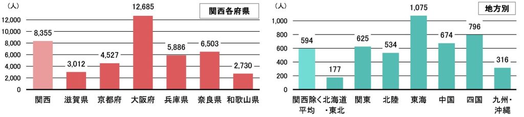 関西内の府県別では大阪府が12,685人と最も多く、次いで奈良県(6,503人)、兵庫県(5,886人)、京都府(4,527人)が続く。関西以外の平均は594人であり、そのうち東海が1,075人と最も多く、次いで四国(796人)、中国(674人)が多くなった。