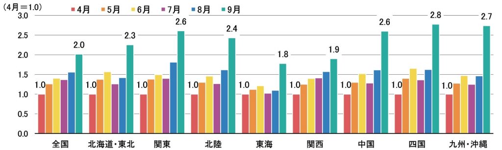 4月以降9月まで、万博の1日あたり来場者数は増加傾向で推移。居住地別に見ると、西日本各地(四国:2.8倍、九州・沖縄:2.7倍、中国:2.6倍)のほか、関東(2.6倍)で増加率が高くなった。