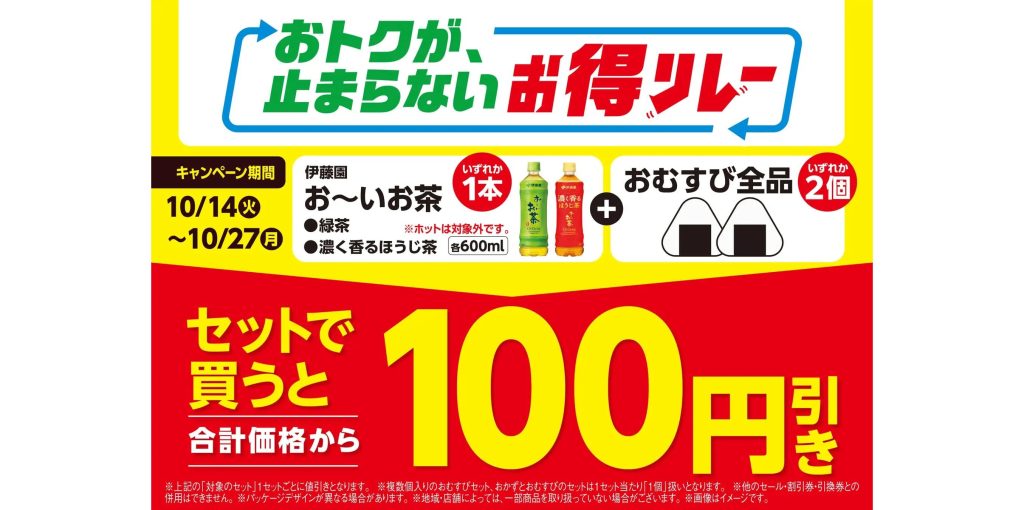ファミリーマートは、おむすびをいずれか2個と「お~いお茶 緑茶」もしくは「お~いお茶 濃く香るほうじ茶」いずれか1本をセットで買うと、合計金額から100円引きとなるキャンペーンを10月27日まで実施すると発表した。
