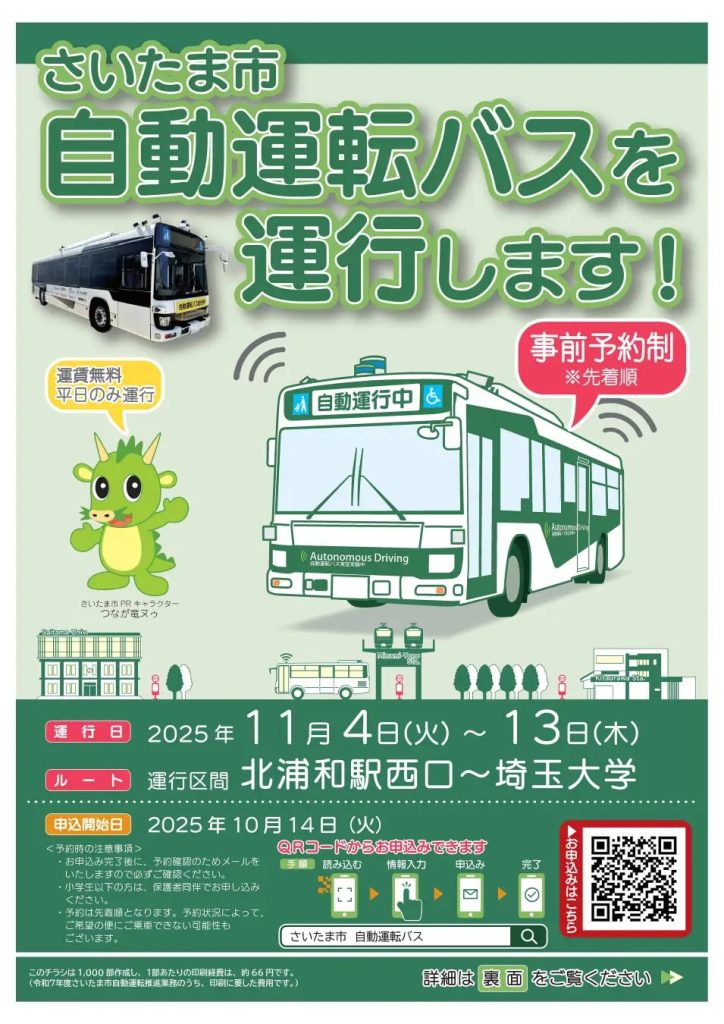 さいたま市は、一般国道463号(埼大通り)において、大型バスによる自動運転実証実験の一般試乗を11月4日から11月13日(土日除く)に実施すると発表した。
