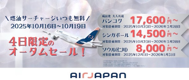 エアージャパン(以下、AirJapan)は、10月16日より4日間限定で、成田=バンコク線、ソウル(仁川)線、シンガポール線の全路線を対象にした「オータムセール」を実施すると発表した。