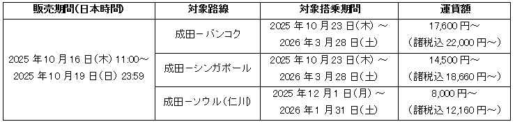 また、搭乗期間を通常よりもさらに長く設定し、バンコク線とシンガポール線は現在販売している2025年冬ダイヤ期間の最終日(2026年3月28日)までと、休み期間までを対象搭乗期間として設定。最大約5カ月間の旅行がセールの対象となるとしている。