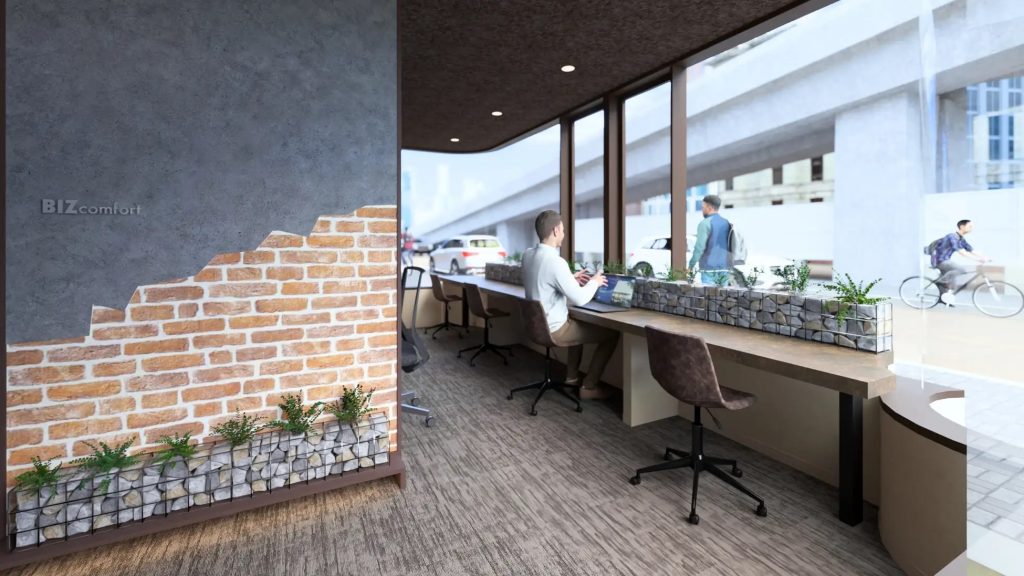 また、集中作業向けのワークブースと、交流・打ち合わせ向けのカフェブースに分かれており、多様な働き方やライフスタイルに対応する構造となっている。