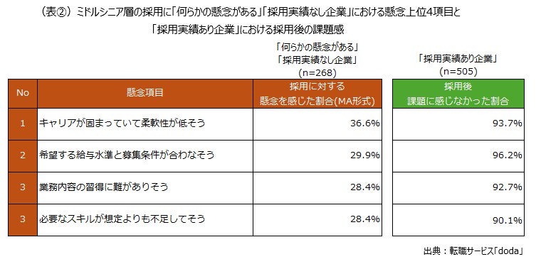 一方、2024年度以降に採用実績がなく、今後も採用予定のない「採用実績なし企業」では、82.5%が「ミドルシニア層の採用に懸念がある」と回答。