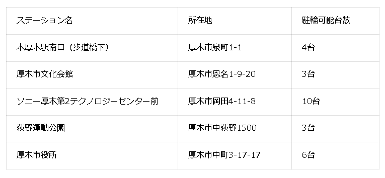 厚木市役所やソニー厚木第2テクノロジーセンター前等の公共施設等19カ所にステーションを設置し、今後、厚木市と協力しながら順次ステーションを拡充していくという。