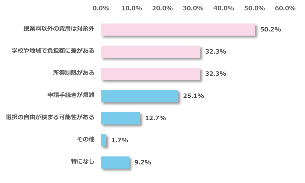 私立高校無償化制度について不満に感じる点としては「授業料以外の費用は対象外」が最多で、次いで「学校や地域で負担額に差がある」「所得制限がある」が続いた。制度のメリットを享受できる範囲や条件に不満を持つ保護者が多いことが明らかに。