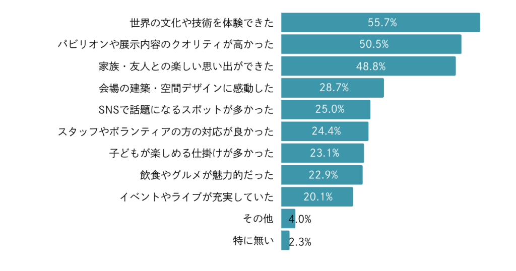また、万博への関心はあったものの、費用・距離・タイミングといった参加へのハードルを越えられなかった層も多く、「行かなかった=無関心」と単純には言い切れない状況がうかがえる。