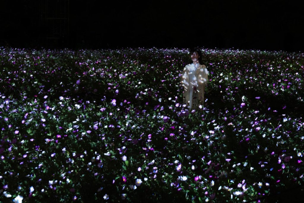 今回公開されるコスモスが光り輝く作品「生命は闇に浮かぶまたたく光 – コスモス」では、闇の中で咲き輝くコスモスが、人々が近くで立ち止まるとさらに強く輝き、音色を響かせ、その輝きはまわりのコスモスへ伝播し、音色を響かせながら連続していくという。