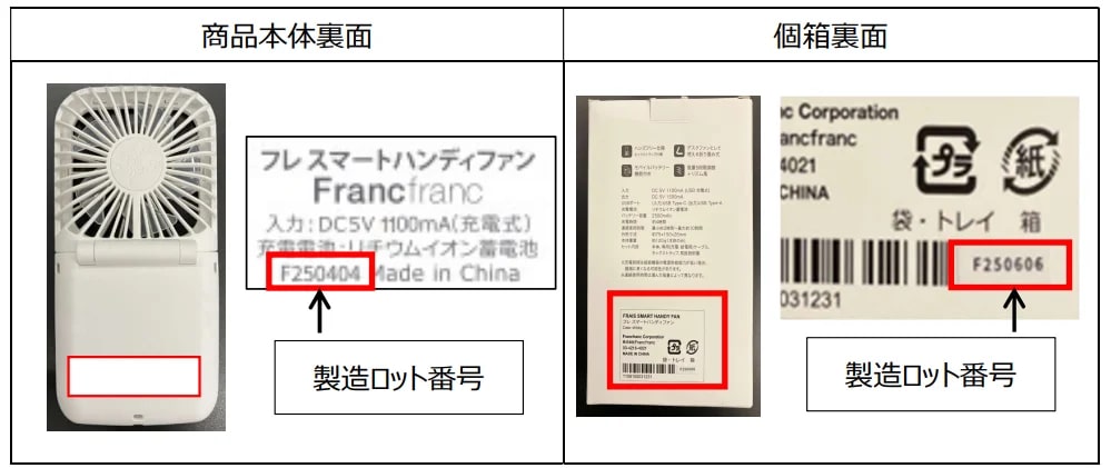 Francfrancは、2025年3月から6月まで販売した「フレ スマートハンディファン(2025年製)」について、充電ICの不具合による動作不良や発熱などの不具合が発生する可能性があるとして、対象商品の自主回収を行うと発表した。