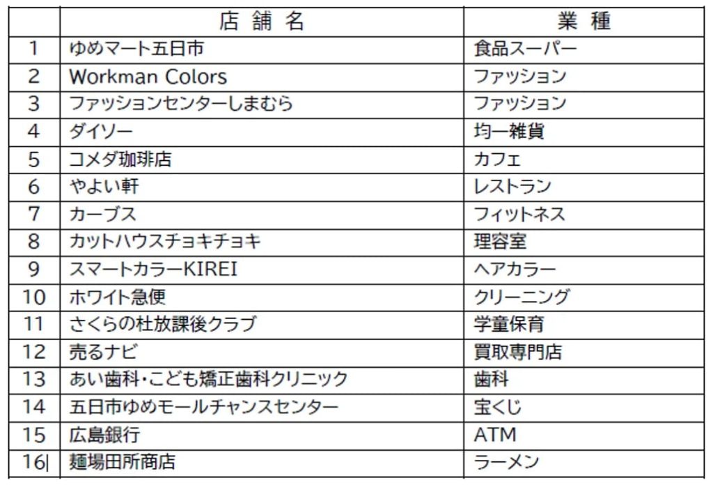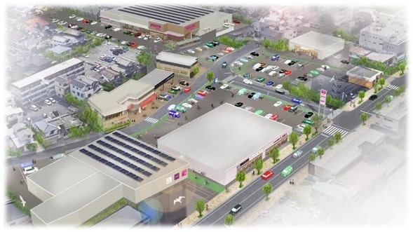 同施設は、食品スーパー「ゆめマート五日市」を核に、アパレル、レストラン、生活雑貨など多様な専門店を集めたオープンモール形式の複合商業施設。専門店が駐車場を取り囲むレイアウトを採用しており、利用者が目的の店舗付近に車を停められる設計になっているという。