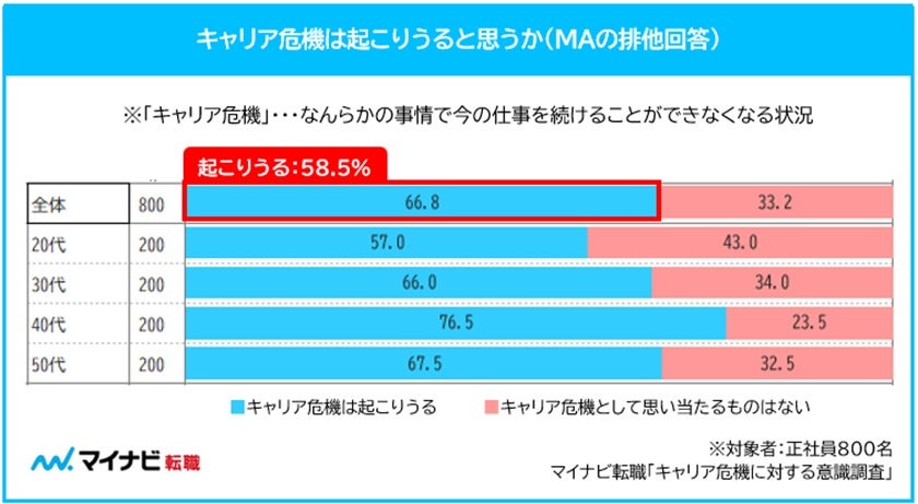 正社員のうち、なんらかの事情で今の仕事を続けることができなくなる「キャリア危機」が起こりうると感じている人は全体で66.8%という結果に。