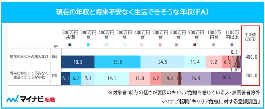 一方、将来不安なく生活できそうな年収を聞くと、中央値は700万円となり現実と300万円のギャップがあることが判明。このギャップが、今の仕事を続けていくことへの不安となっている可能性があると同社は考察。