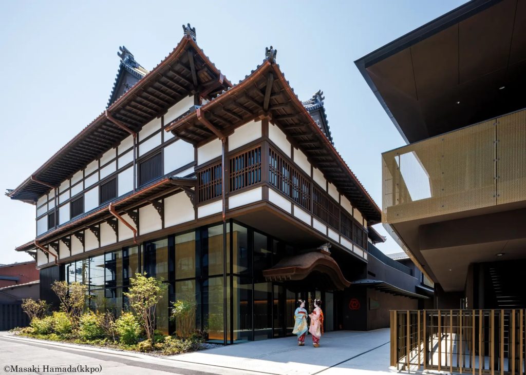 同プロジェクトは、宮川町の風情漂う街並みと東山の景観との調和を図るため、既存建物の特徴を活かしたデザインを採用。宮川町のシンボルでもある「歌舞練場大屋根」を再建するなど、随所に街の記憶を継承したつくりとなっている。